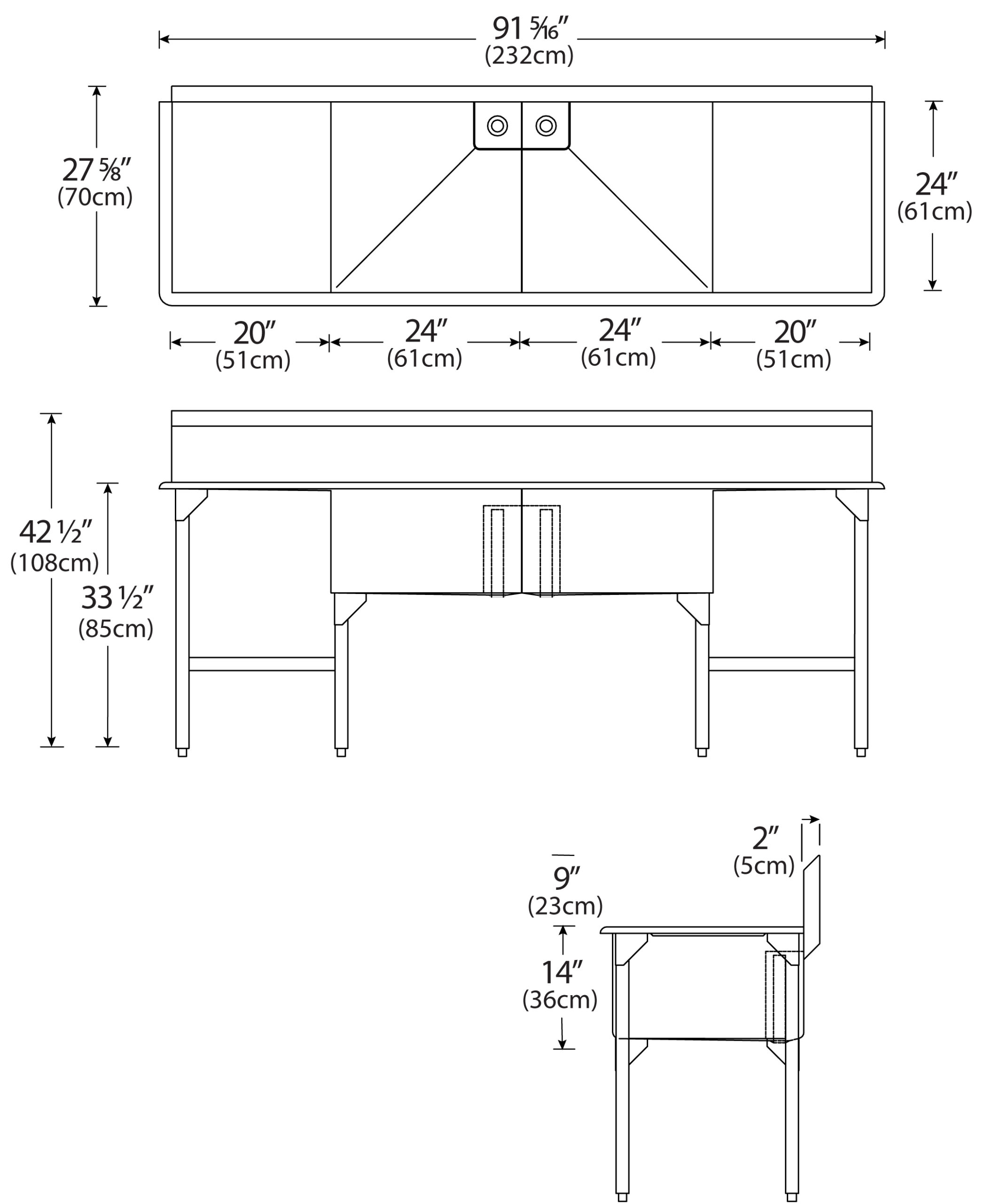 Évier utilitaire sur pattes à trois cuves. Dimensions hors-tout de 91 5/16 po x 27 ⅝ po (232 cm x 70 cm), dimensions de la cuve 24 po x 24 po (61 cm x 61 cm) et une profondeur de 14 po (36 cm). Évacuation droite-arrière et gauche-arrière, duplex de 1 ½ avec trop-plein et garde protectrice inclus, fini satiné brossé, calibre 16, T300.