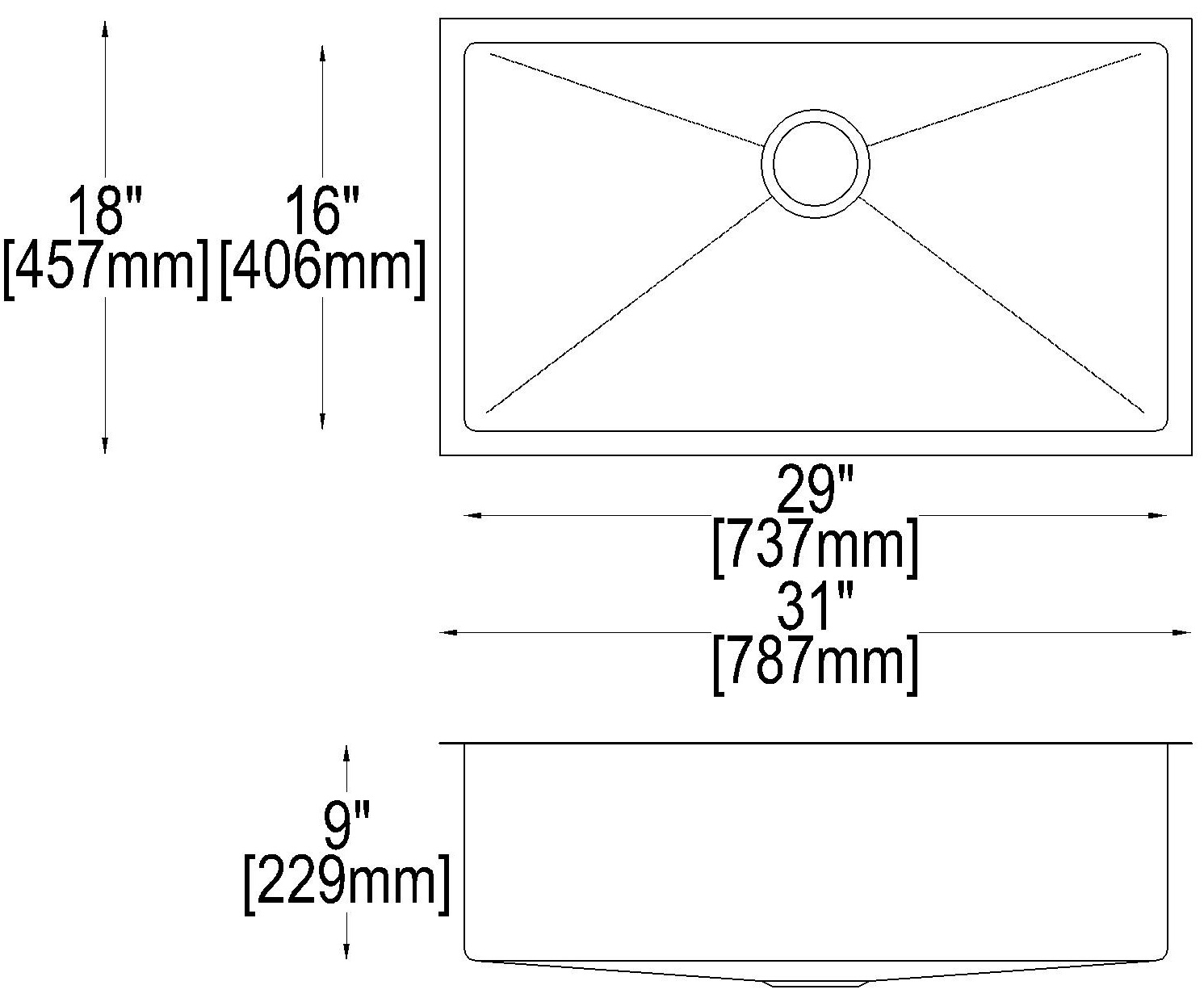 Évier en acier inoxydable, une cuve à montage sous le plan de travail. Dimensions hors-tout: 18 po x 31 po (46 cm x 79 cm), dimensions de la cuve: 16 po x 29 po (41 cm x  74 cm), profondeur: 9 po (23 cm). Évacuation centrée-arrière, panier-crépine de 3 ½ po (9 cm) inclus, finition satiné brossé, calibre 18.