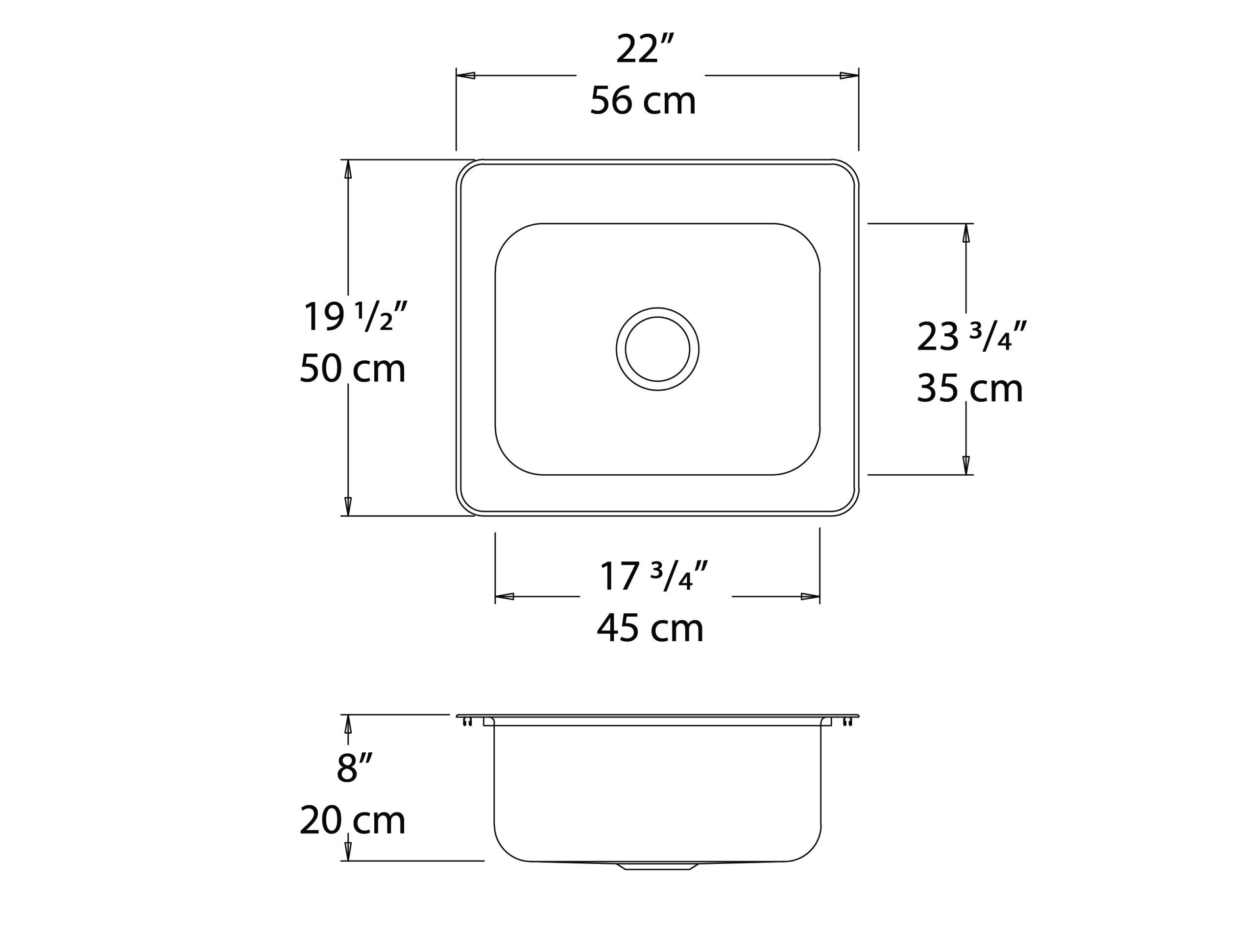 Évier en acier inoxydable à montage sur le plan de travail avec rebord, dimensions hors-tout: 22 po x 19 ½ po (56 cm x 50 cm), dimensions de la cuve: 17 ¾ po x 13 ¾ po (45 cm x 35 cm), profondeur: 8 po (20 cm). Évacuation centrée, panier-crépine de 3 ½ po (9 cm) et cordier inclus, fini satiné brossé, calibre 18. T300, système de serrage à canal en « U », pourtour intégral, joint de mousse installé, gabarit et matériel d’installation inclus.