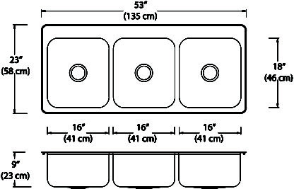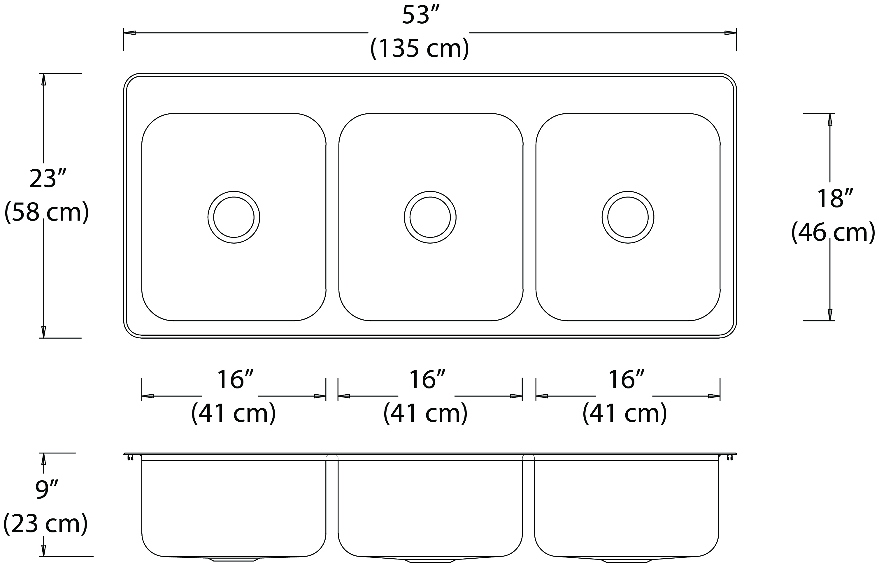 Évier en acier inoxydable à trois cuves à montage sur le plan de travail avec rebord. Dimensions hors-tout de 53 po x 23 po (135 cm x 58 cm), dimensions des cuves 16 po x 18 po (41 cm x 46 cm) et une profondeur de 9 po (23 cm). Évacuation de 3 ½ po (9 cm) centrée, fini satiné brossé, calibre 18, T316. Tampons insonorisant, gabarit and matériel d’installation inclus.