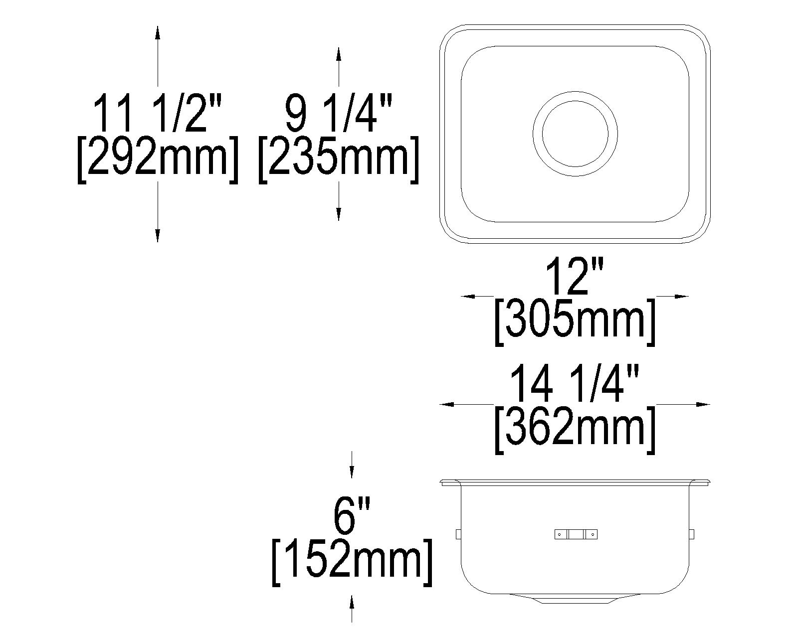 Stainless steel single bowl drop-in sink. Overall dimensions of 11 ½” x 14 ¼” (29 cm x 36 cm), bowl dimensions of 9 ¼” x 12” (23 cm x 30 cm), and a depth of 6” (15 cm). Centre waste, 3 ½” (9 cm) strainer included, mirror finish, 18Ga. Off-the-bowl clamp system, factory installed SynkSeal™ foam-in-place gasket, sound deadening pads, includes template and installation hardware.