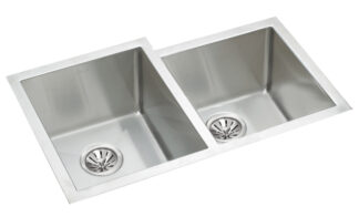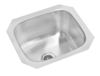 Stainless steel single bowl drop-in sink. Overall dimensions of 13 ⅞” x 14 ¼” (35 cm x 36 cm), bowl dimensions of 9 ¼” x 12” (23 cm x 30 cm), and a depth of 6” (15 cm). Centre waste, 3 ½” (9 cm) strainer included, mirror finish, 18Ga. Off-the-bowl clamp system, factory installed SynkSeal™ foam-in-place gasket, sound deadening pads, custom hole drilling available, includes template and installation hardware.