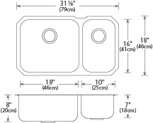Stainless steel one and a half bowl drop-in sink. Overall dimensions of 18” x 31 ½” (46 cm x 80 cm), left bowl dimensions of 16” x 18” (41 cm x 46 cm), right bowl dimensions of 16” x 10” (41 cm x 25 cm), and a depth of 8” (20 cm) and 7” (18 cm). Centre-rear waste, 3 ½” (9 cm) strainer included, brushed satin finish, 18Ga. Off-the-bowl clamp system, factory installed SynkSeal™ foam-in-place gasket, sound deadening pads, includes template and installation hardware.
