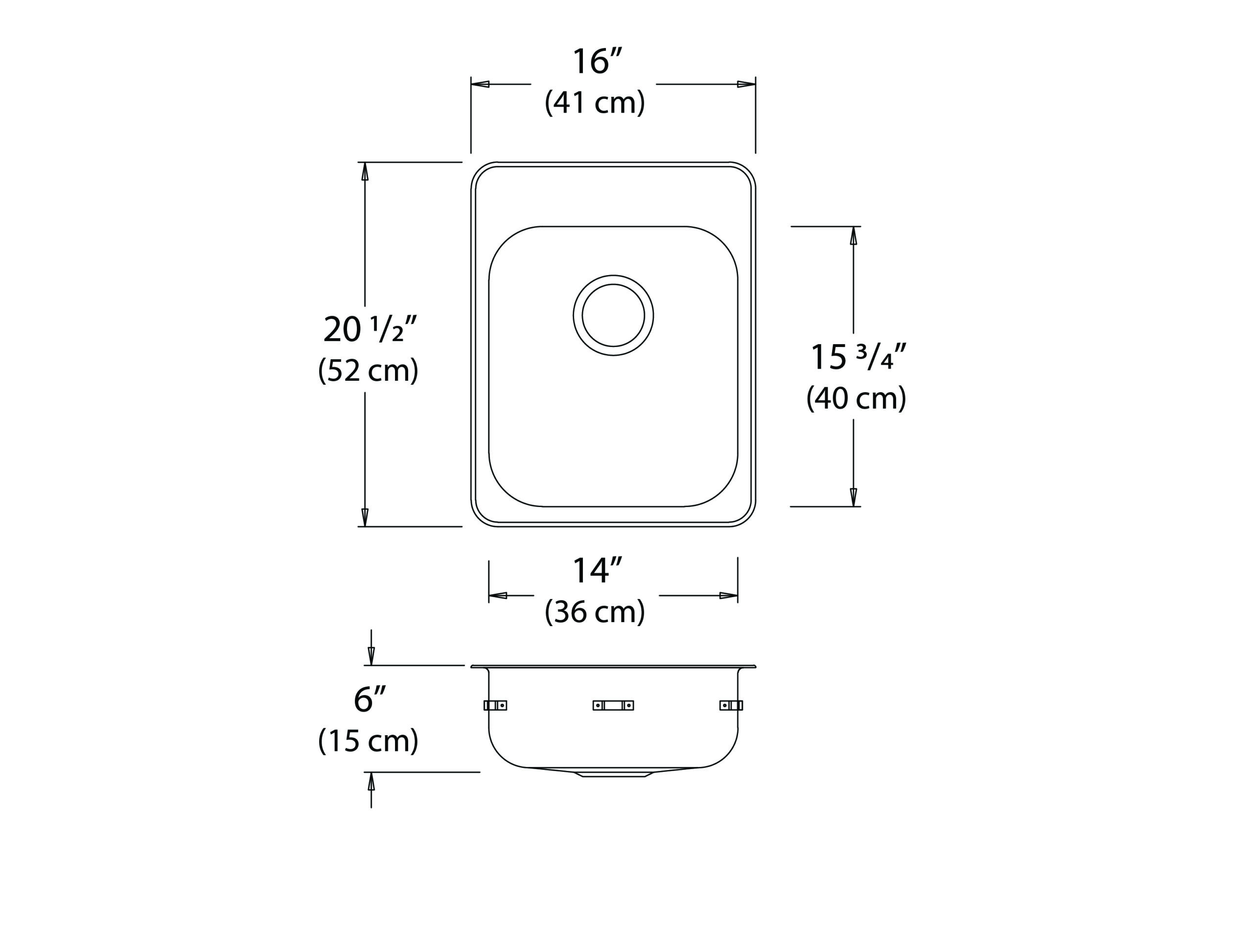 Stainless steel single bowl drop-in sink with ledge, overall dimensions of 16” x 20 ½” (41 cm x 52 cm), bowl dimension of 14” x 16” (36 cm x 41 cm) and a depth of 6” (15 cm). Centre-rear waste, 3 ½” (9 cm) basket strainer assembly with tailpiece included, satin finish, 20Ga. T300, off-the-bowl clamp system, self-rimming, SynkSeal™ foam-in-place gasket installed, includes template and installation hardware.