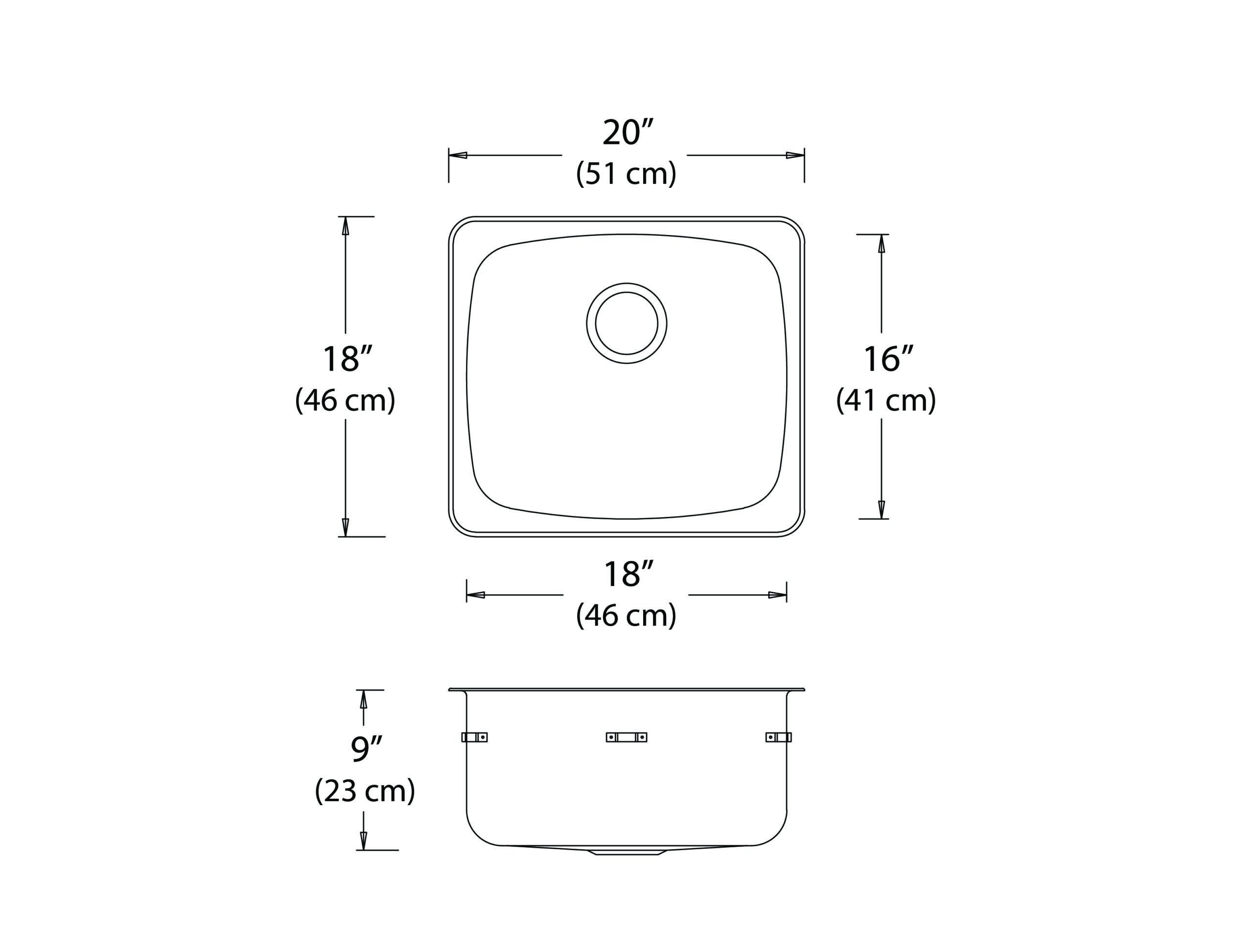 Stainless steel single bowl drop-in sink without ledge, overall dimensions of 20″ x 18″ (51 cm x 46 cm), bowl dimensions of 18″ x 16″ (46 cm x 41 cm) and a depth of 9″ (23 cm). Centre-rear waste, 3 ½” (9 cm) basket strainer assembly with tailpiece included, satin finish, 18Ga., T300, off-the-bowl clamp system, self-rimming, SynkSeal™ foam-in-place gasket installed, sound deadening pads. Includes template and installation hardware.