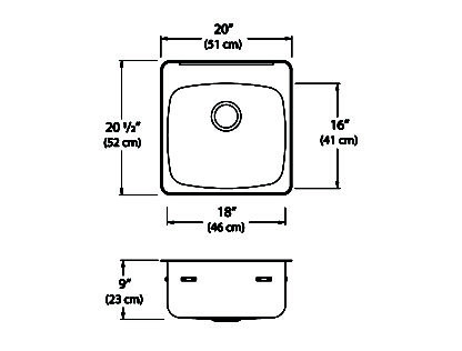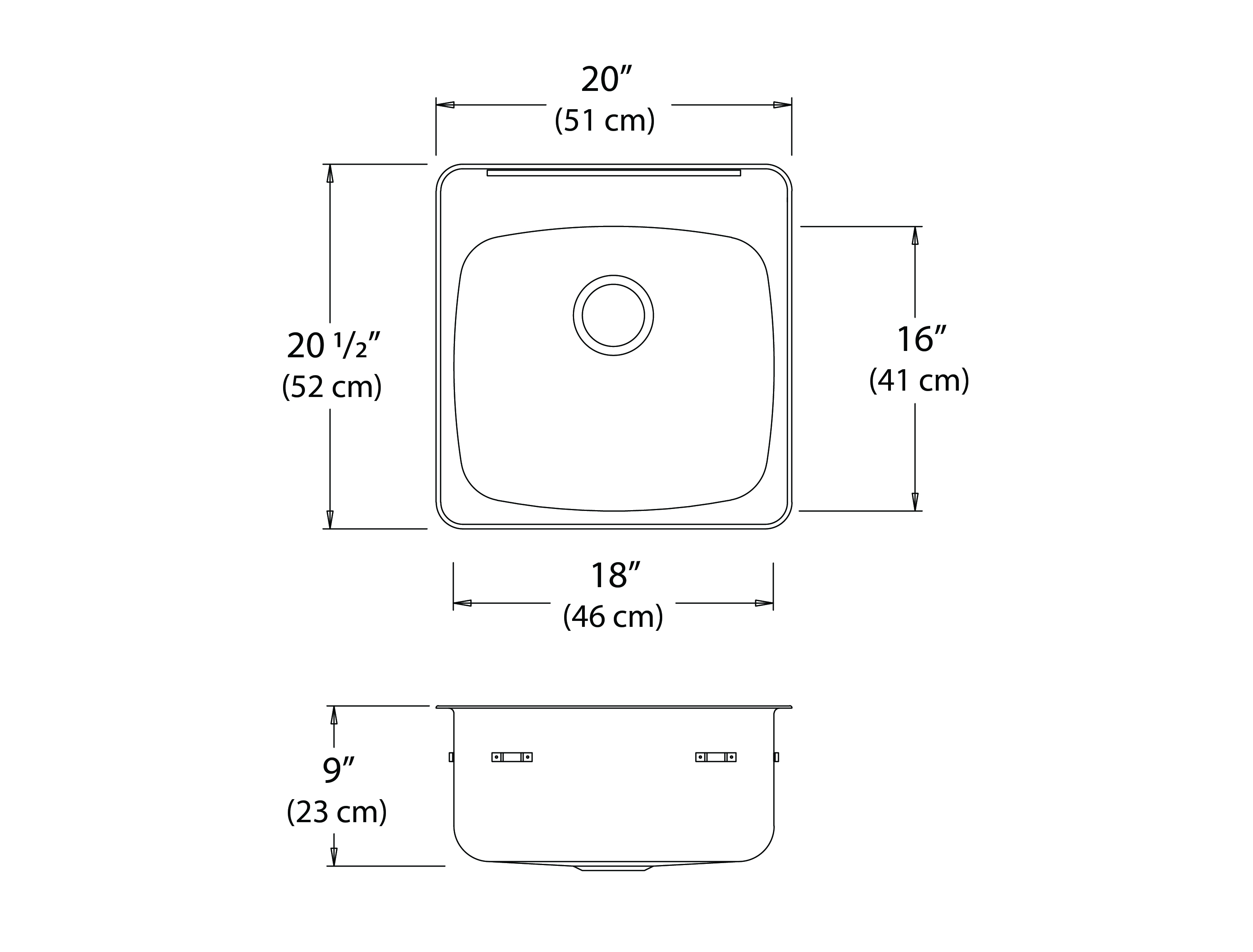 Stainless steel single bowl drop-in sink with ledge, overall dimensions of 20” x 20 ½” (51 cm x 52 cm), bowl dimension of 18” x 16” (46 cm x 41 cm) and a depth of 9” (23 cm). Centre-rear waste, 3 ½” (9 cm) basket strainer assembly with tailpiece included, satin finish, 18Ga. T300, off-the-bowl clamp system, self-rimming, SynkSeal™ foam-in-place gasket installed, includes template and installation hardware.