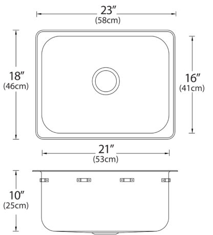 Stainless steel single bowl drop-in sink without ledge, overall dimensions of 23” x 18” (58 cm x 46 cm), bowl dimension of 21” x 15 ¾” (53 cm x 40 cm) and a depth of 10” (25 cm). Centre-rear waste, 3 ½” (9 cm) basket strainer assembly with tailpiece included, satin finish, 18Ga. T301, off-the-bowl clamp system, self-rimming, SynkSeal™ foam-in-place gasket installed, includes template and installation hardware.