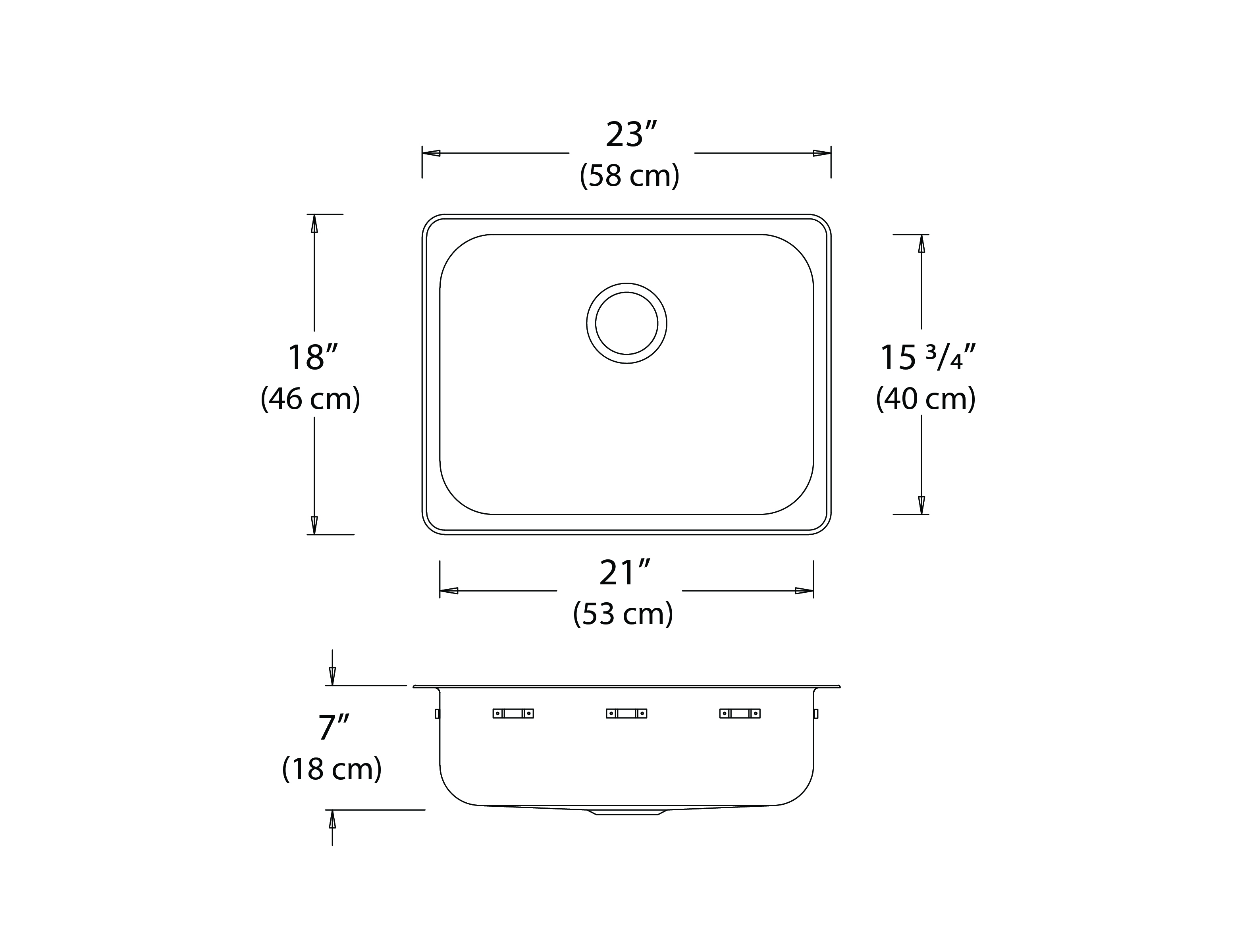Stainless steel single bowl drop-in sink without ledge, overall dimensions of 23” x 18” (58 cm x 46 cm), bowl dimension of 21” x 15 ¾” (53 cm x 40 cm) and a depth of 7” (18 cm). Centre-rear waste, 3 ½” (9 cm) basket strainer assembly with tailpiece included, satin finish, 20Ga. T300, off-the-bowl clamp system, self-rimming, SynkSeal™ foam-in-place gasket installed, includes template and installation hardware.