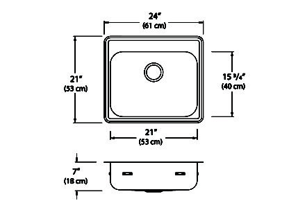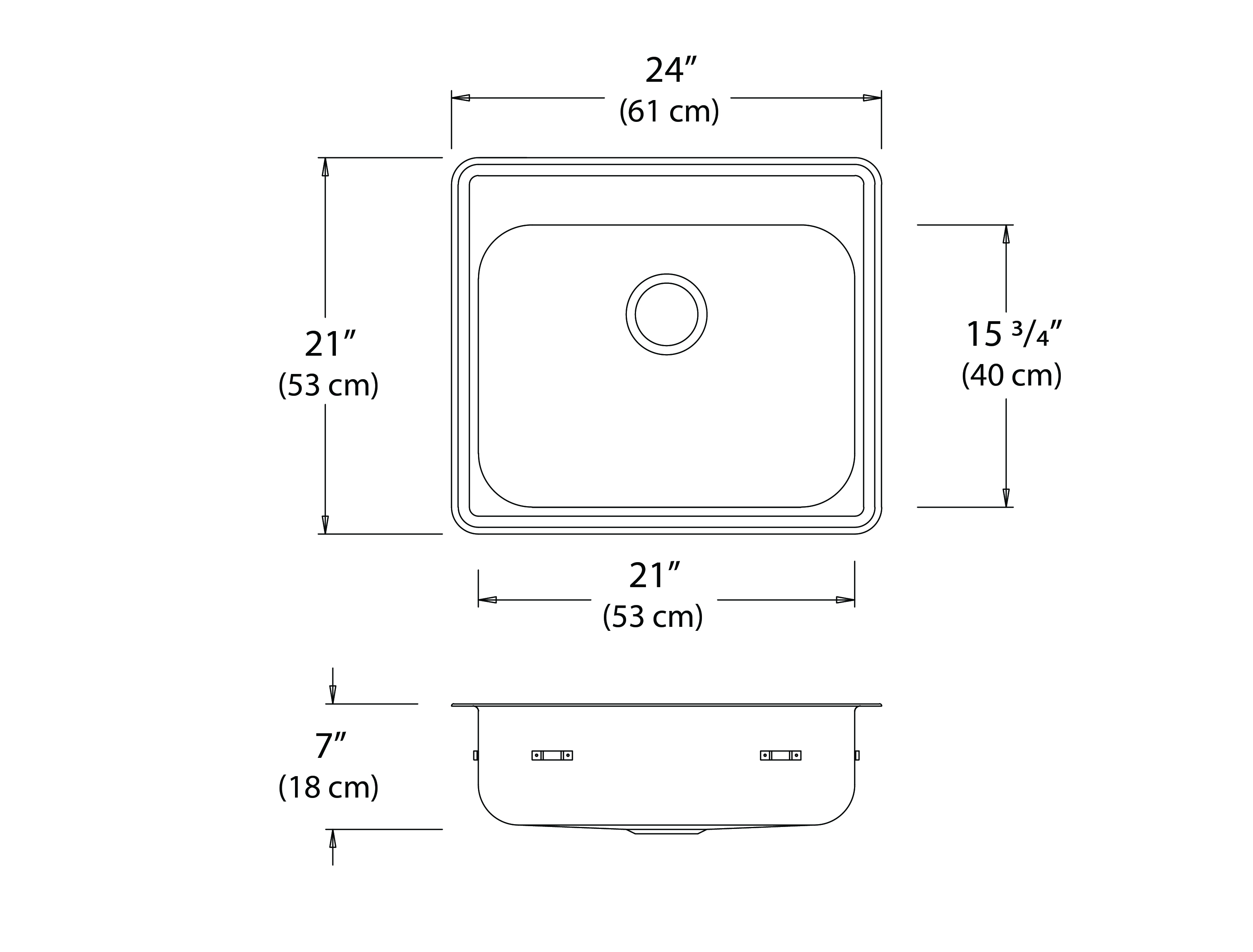Stainless steel single bowl drop-in sink with ledge, overall dimensions of 24” x 21” (61 cm x 53 cm), bowl dimension of 21” x 15 ¾” (53 cm x 40 cm) and a depth of 7” (18 cm). centre-rear waste, 3 ½” (9 cm) basket strainer assembly with tailpiece included, satin finish, 18Ga. T300, off-the-bowl clamp system, self-rimming, SynkSeal™ foam-in-place gasket installed, includes template and installation hardware.