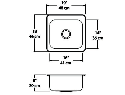 Stainless steel single bowl drop-in sink with ledge, overall dimensions of 19” x 18” (48 cm x 46 cm), bowl dimension of 16” x 14” (41 cm x 36 cm) and a depth of 8” (20 cm). Centre waste, 3 ½” (9 cm) basket strainer assembly with tailpiece included, satin finish, 20Ga. T300, U-channel clamp system, self-rimming, foam-in-place gasket installed, includes template and installation hardware.