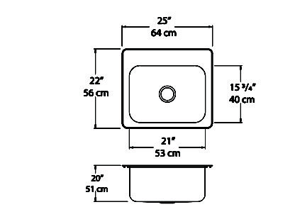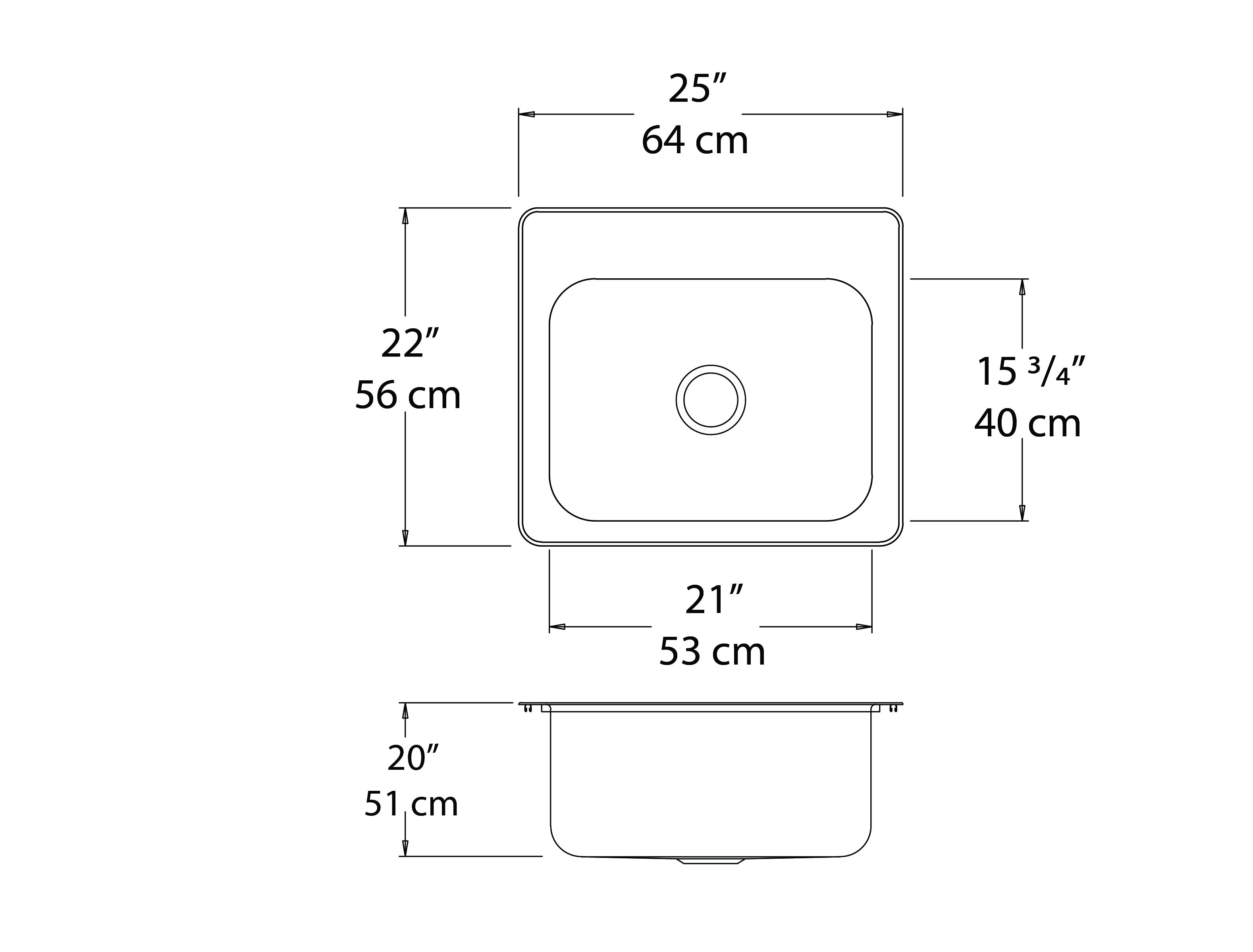 Stainless steel single bowl drop-in sink with ledge, overall dimensions of 25” x 22” (64 cm x 56 cm), bowl dimension of 21” x 15 ¾” (53 cm x 40 cm) and a depth of 10” (25 cm). Centre waste, 3 ½” (9 cm) basket strainer assembly with tailpiece included, satin finish, 18Ga. T300, U-channel clamp system, self-rimming, foam-in-place gasket installed, includes template and installation hardware.