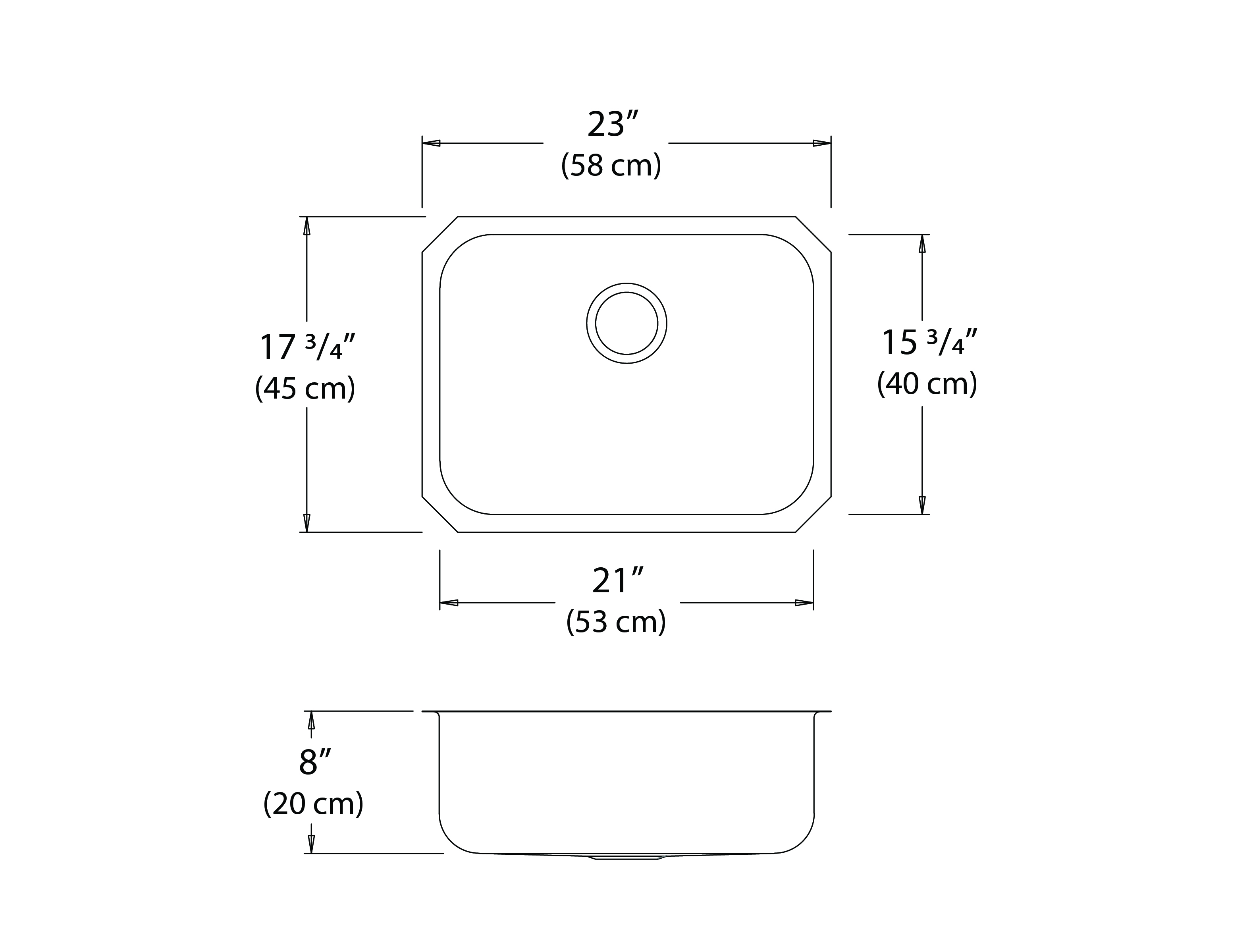 Stainless steel single bowl undermount sink, overall dimensions of 23” x 17 ¾” (58 cm x 45 cm), bowl dimension of 21” x 15 ¾” (53 cm x 40 cm) and a depth of 8” (20 cm). Centre-rear waste, 3 ½” (9 cm) basket strainer assembly with tailpiece included, satin finish, 18Ga., T316, sound deadening pads.