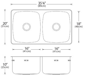 Stainless steel triple bowl drop-in sink without a ledge. Overall dimensions of 47 ¼” x 19” (120 cm x 48 cm), bowl dimensions of 14” x 16” (36 cm x 41 cm) and a depth of 7” (18 cm). Centre waste, 3 ½” (9 cm) basket strainer assembly with tailpiece included, satin finish 18Ga., T316. Sound deadening pads, template and installation hardware included.a