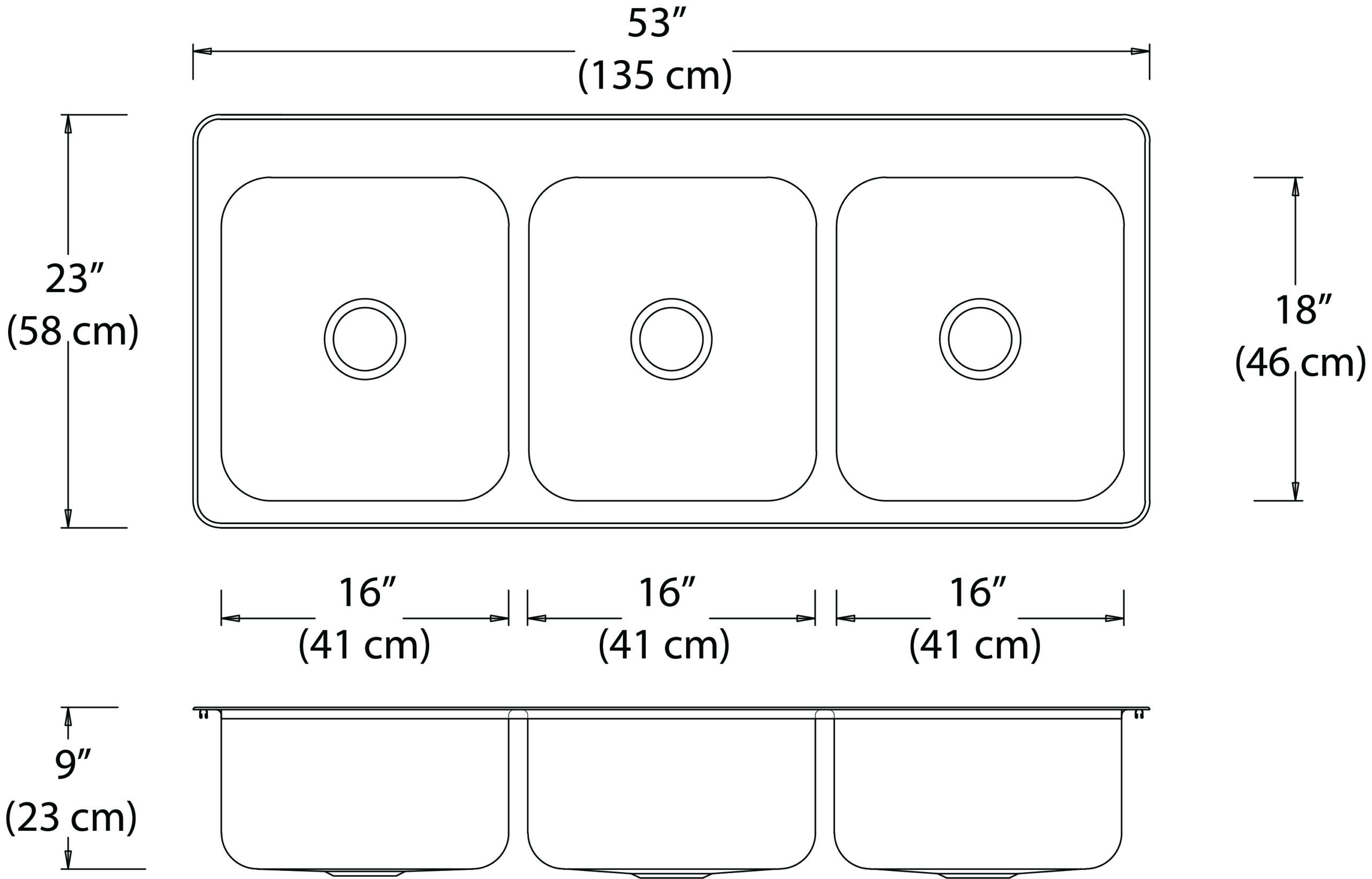 Stainless steel triple bowl drop-in sink with a ledge. Overall dimensions of 53” x 23” (135 cm x 58 cm), bowl dimensions of 16” x 18” (41 cm x 46 cm) and a depth of 9” (23 cm). Centre waste, 3 ½” (9 cm) basket strainer assembly with tailpiece included, satin finish, 18Ga., T300. Sound deadening pads, template and installation hardware included.