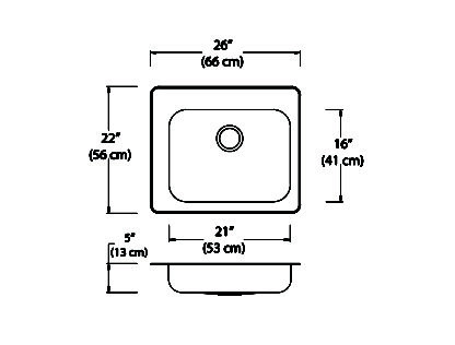 Stainless steel single bowl drop-in sink with left and back ledge. Overall dimensions of 26” x 22” (66 cm x 56 cm), bowl dimensions of 21” x 16” (53 cm x 41 cm) and a depth of 5” (13 cm). Centre-rear waste, 3 ½” (9 cm) basket strainer assembly with tailpiece included, satin finish, 18Ga., T300. Sound deadening pads, template and installation hardware included.