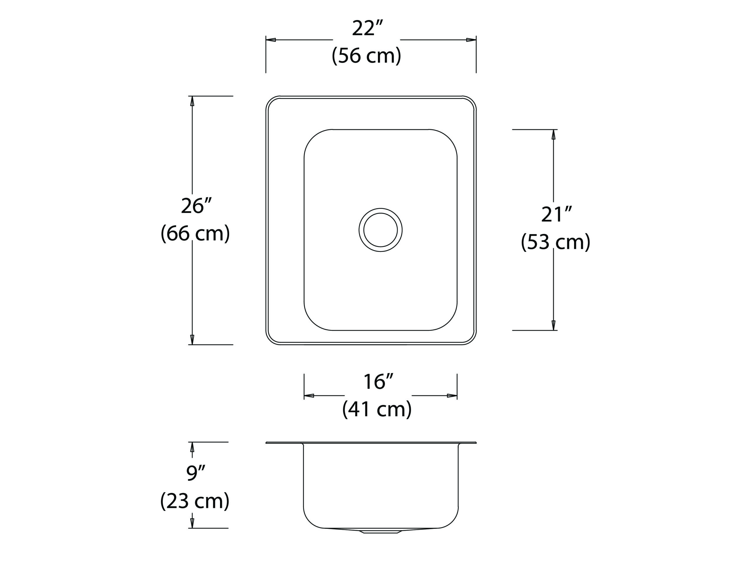 Stainless steel single bowl drop-in sink with left and back ledge. Overall dimensions of 22” x 26” (56 cm x 66 cm), bowl dimensions of 16” x 21” (41 cm x 53 cm) and a depth of 9” (23 cm). Centre waste, 3 ½” (9 cm) basket strainer assembly with tailpiece included, satin finish, 18Ga., T300. Sound deadening pads, template and installation hardware included.a