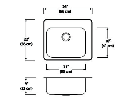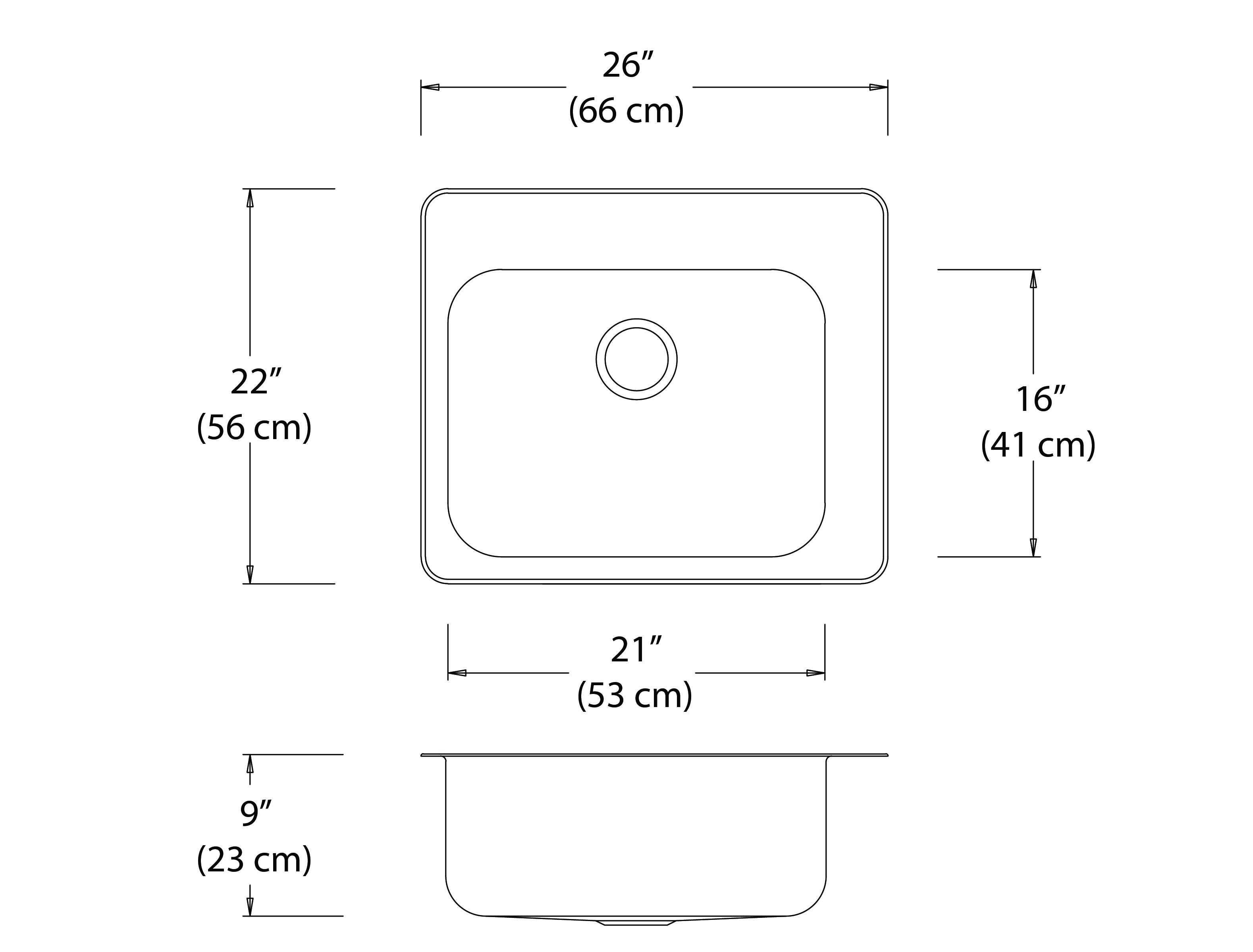 Stainless steel single bowl drop-in sink with right and back ledge. Overall dimensions of 26” x 22” (65 cm x 56 cm), bowl dimensions of 21” x 16” (53 cm x 41 cm) and a depth of 9” (23 cm). Centre waste, 3 ½” (9 cm) basket strainer assembly with tailpiece included, satin finish, 18Ga., T300. Sound deadening pads, template and installation hardware included.