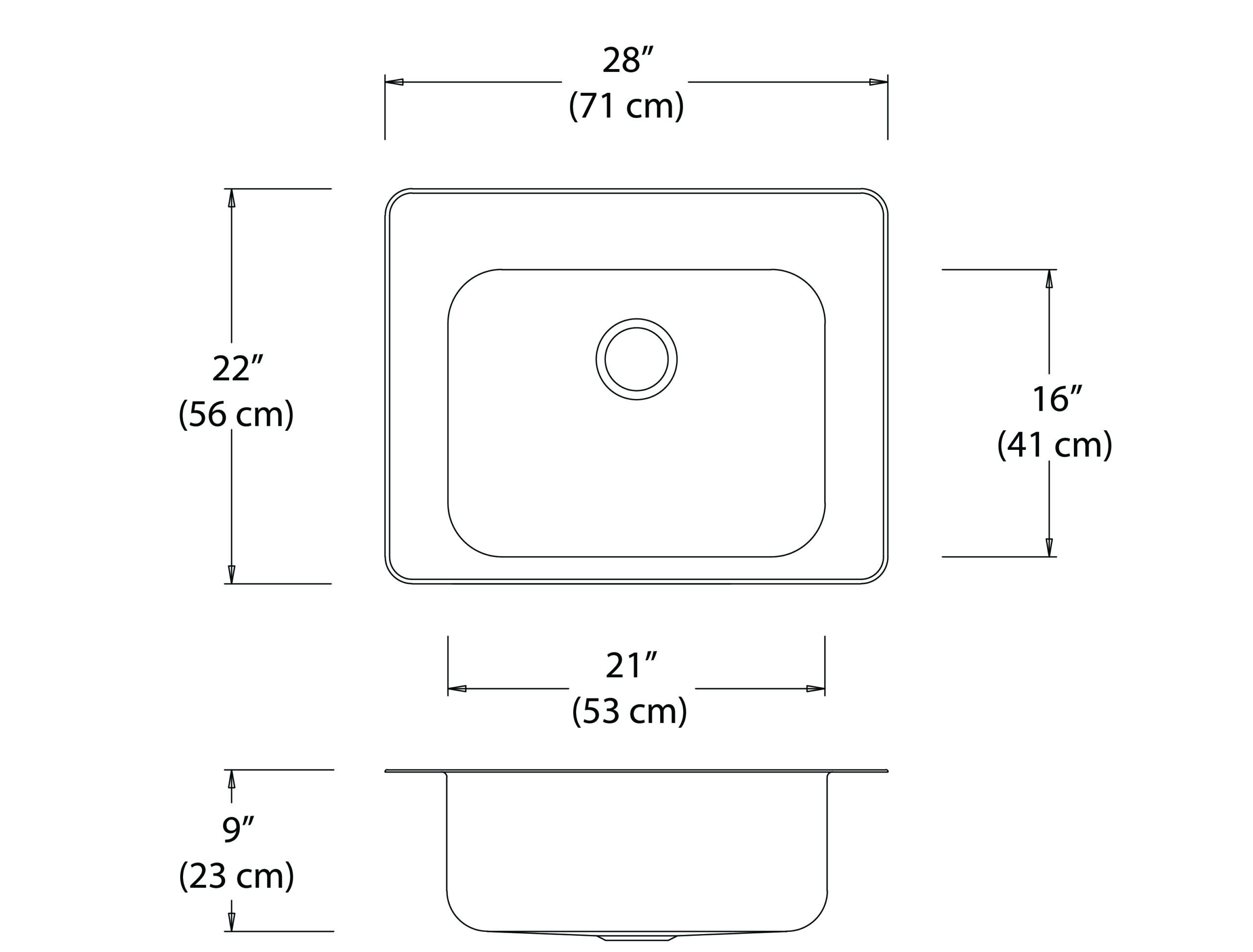 Stainless steel single bowl drop-in sink with left, right and back ledge. Overall dimensions of 28” x 22” (71 cm x 56 cm), bowl dimensions of 21” x 16” (53 cm x 41 cm) and a depth of 9” (23 cm). Centre-rear waste, 3 ½” (9 cm) basket strainer assembly with tailpiece included, satin finish, 18Ga., T300. Sound deadening pads, template and installation hardware included.