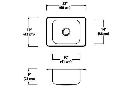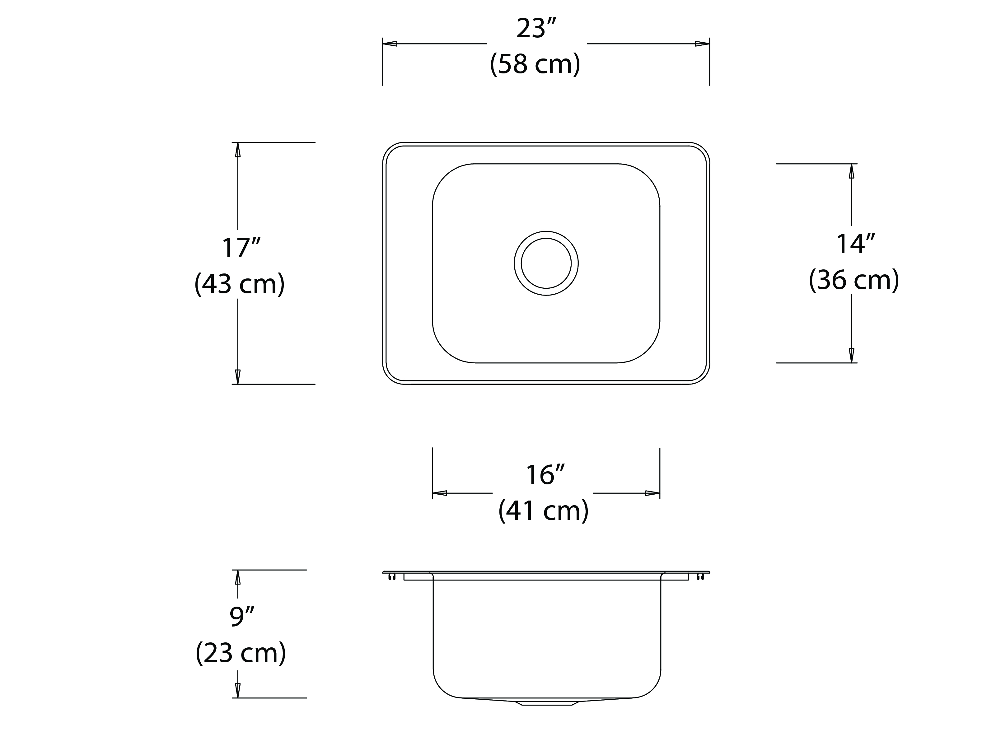 Stainless steel single bowl drop-in sink with left and right ledge. Overall dimensions of 23” x 17” (58 cm x 43 cm), bowl dimensions of 16” x 14” (41 cm x 36 cm) and a depth of 9” (23 cm). Centre waste, 3 ½” (9 cm) basket strainer assembly with tailpiece included, satin finish, 18Ga., T300. Sound deadening pads, template and installation hardware included.