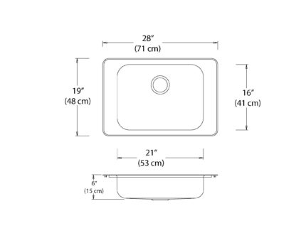 Stainless steel single bowl drop-in sink with left and right ledge. Overall dimensions of 28” x 19” (71 cm x 48 cm), bowl dimensions of 21” x 16” (53 cm x 41 cm) and a depth of 6” (15 cm). Centre-rear waste, 3 ½” (9 cm) basket strainer assembly with tailpiece included, satin finish, 18Ga., T300. Sound deadening pads, template and installation hardware included.