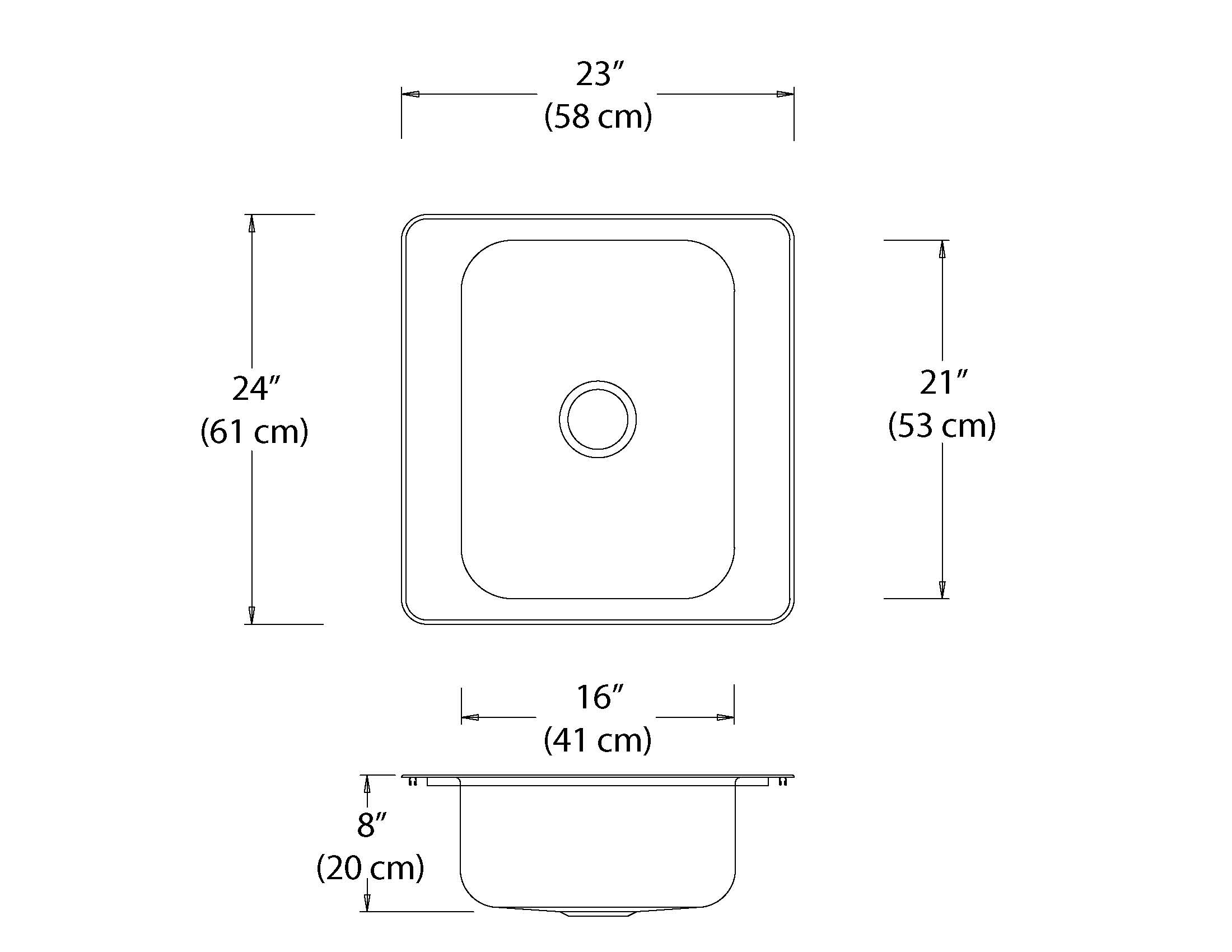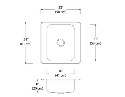 Stainless steel single bowl drop-in sink with left and right ledge. Overall dimensions of 23” x 24” (58 cm x 61 cm), bowl dimensions of 16” x 21” (41 cm x 53 cm) and a depth of 8” (20 cm). Centre waste, 3 ½” (9 cm) basket strainer assembly with tailpiece included, satin finish, 18Ga., T316. Sound deadening pads, template and installation hardware included.