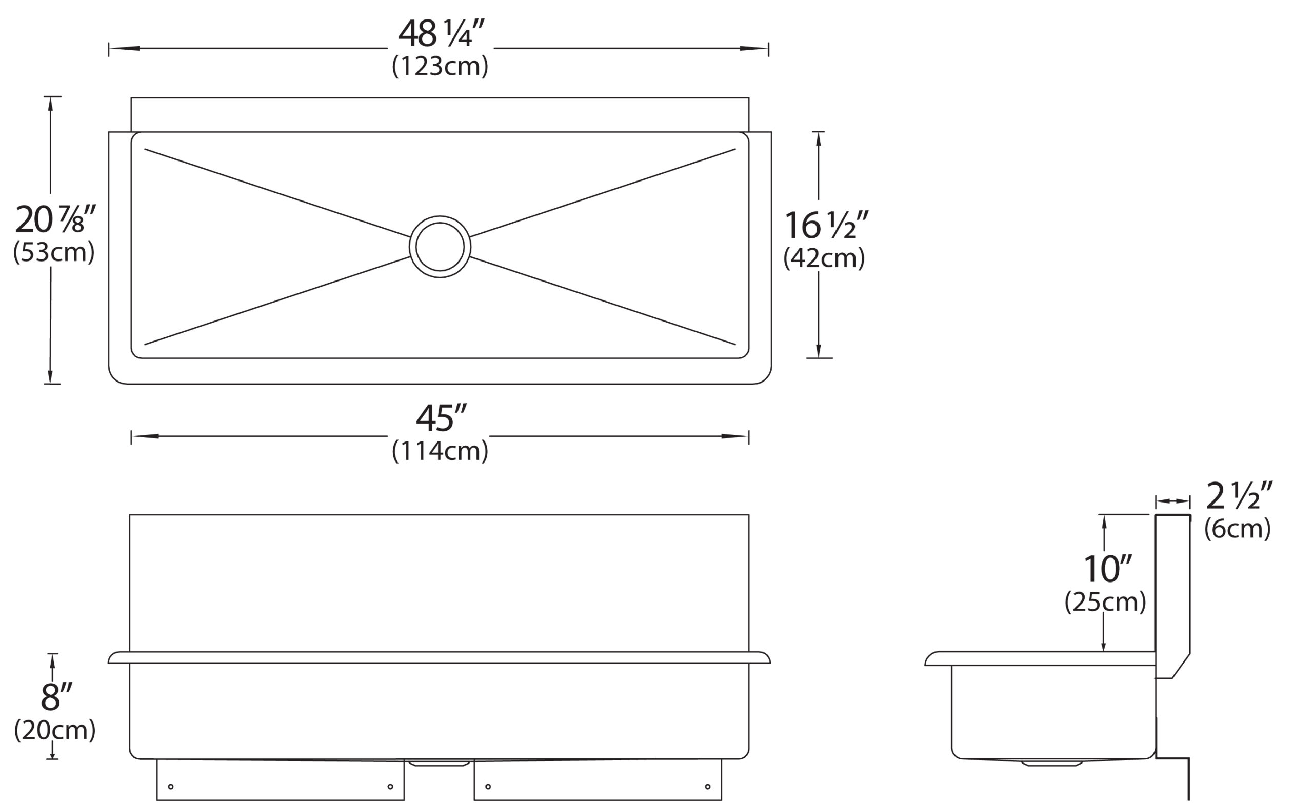 Stainless steel single bowl wall-mount trough sink. Overall dimensions of 48 ¼” x 20 ⅞” (123 cm x 53 cm), bowl dimensions of 45” x 16 ½” (114 cm x 42 cm) and a depth of 8” (20 cm). Centre waste, 3 ½” (9 cm) basket strainer assembly with tailpiece included, satin finish, 14Ga., T304. Sound deadening pads, template and installation hardware included.