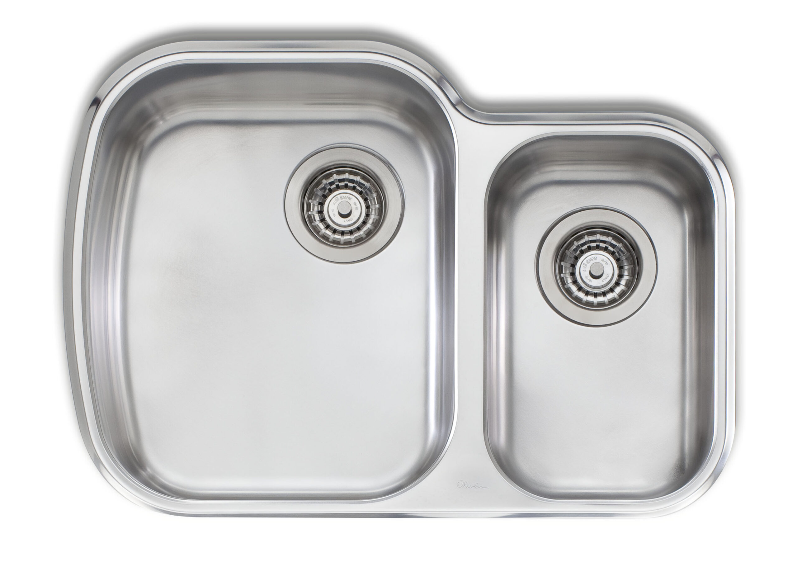 Stainless steel double bowl undermount Oliveri sink. Overall dimensions of 19 ¾” x 27 ⅝” (48 cm x 69 cm), left bowl dimensions of 16 ½” x 13 ¾” (41 cm x 33 cm), right bowl dimensions of 13 ¾” x 8 ½” (33 cm x  20 cm), and a depth of 8″ (20 cm) and 6″ (15 cm). Centre-rear waste, 3 ½” (9 cm) strainer included.